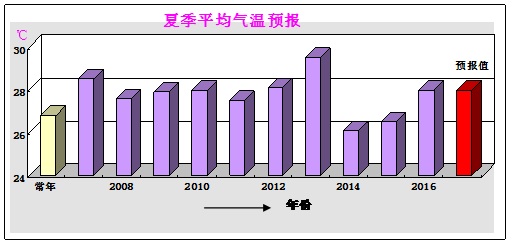 預計今年夏季平均氣溫為27.5-28.5,較常年偏高,比去年(26.3)明顯偏高。高溫日數1620天、較常年偏多,比去年(23天)偏少。極端最高氣溫3940℃。